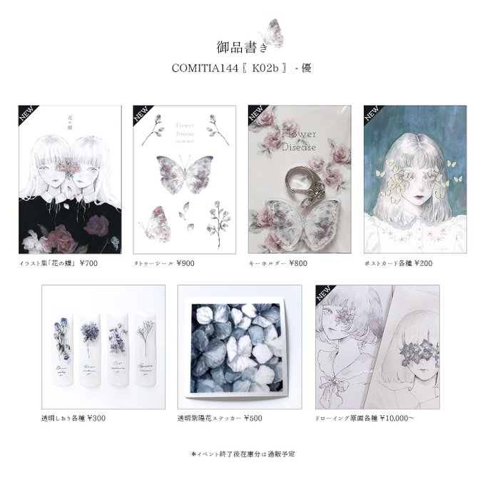 5/5コミティア144【K02b】優 新作はイラスト集、タトゥシールとキーホルダー、ドローイング原画です。 よろしくお願いします💐 #COMITIA144 #コミティア144
