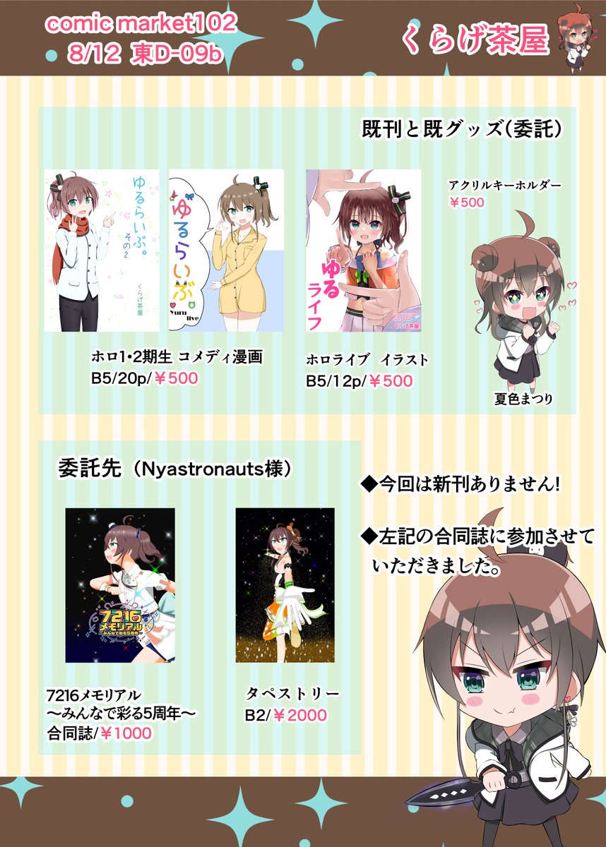 23 48 こちら今回のコミケのお品書きです! 1日目 東D-09bにて委託・お手伝いさせていただきます…! 委託先のにゃすら先生のグッズ詳細はリプ欄に、 私の方は今回新刊がなく、 主にまつりちゃん中心の既刊・グッズの頒布となります! いずれもよろしくお願いいたします…! 23/08/10 20:16