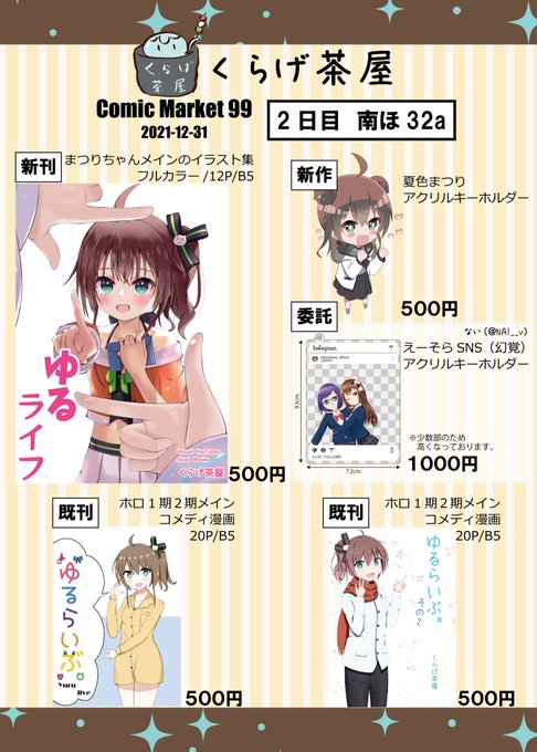 61 132 こちらC99のお品書きになります! 今回は新刊・既刊・アクキー、 いずれも(1・2期含む)まつりちゃんづくしに加え、 他ホロメンも新規描き下ろしで描いております! よろしくお願いしますー! 21/12/26 19:22