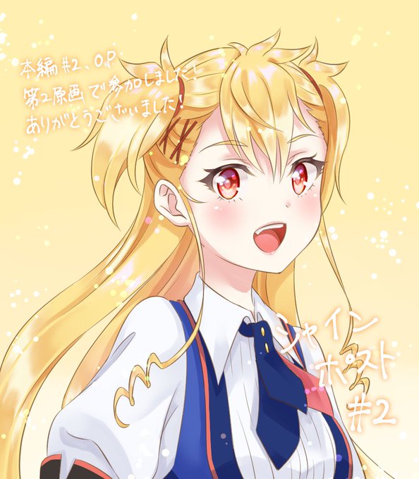 先週に引き続きシャインポスト第2話とOPの第二原画で参加させて頂きました!😆 ライブパートの原画も拾わせて頂いて楽しかったです!🕺夜遅くにご視聴ありがとうございました!🥰💛💙💖 今週はたくさん描かせてもらった理王様です💛 #シャインポスト