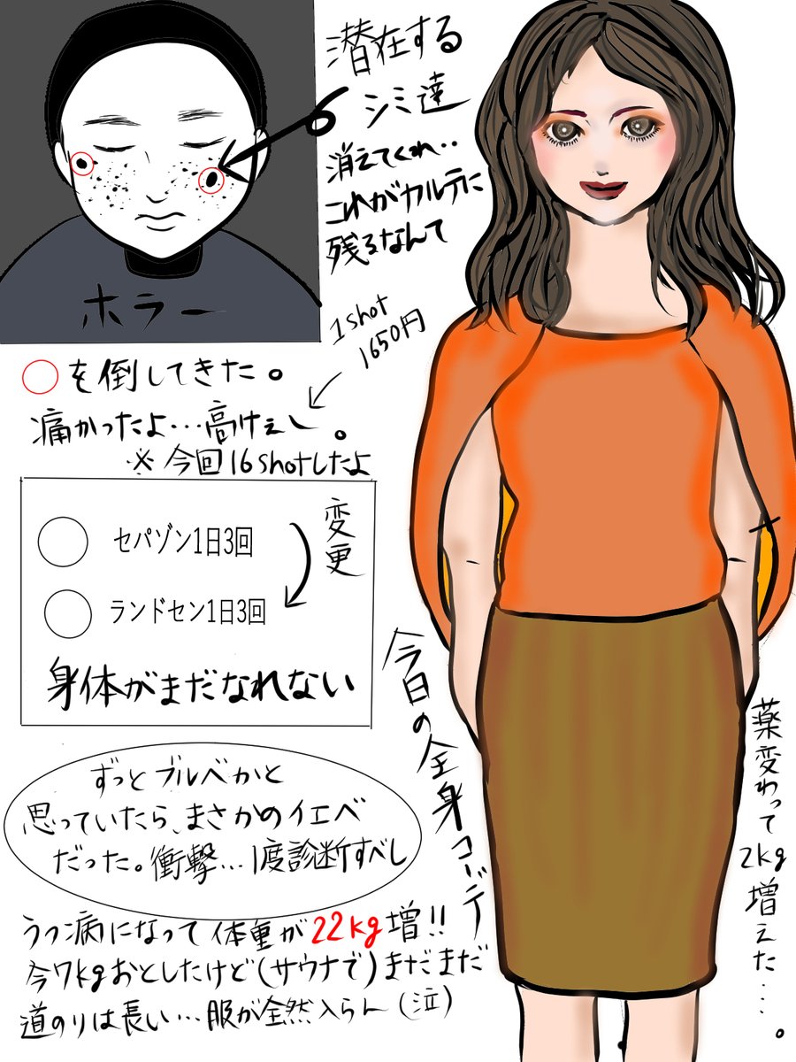 #イラスト #漫画でつながりたい #絵師さんとつながりたい #美容にこだわるアラフォー 長年嫌だったシミをとってきたお話 2週間後にカサブタになってとれるらしい それにしても、体重増加には困ったもんだよ