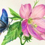 #色鉛筆画 #アナログ絵 練習で芙蓉と蝶を描いてみた…! 庭に咲いてる花が芙蓉という名前だと初めて知りました…