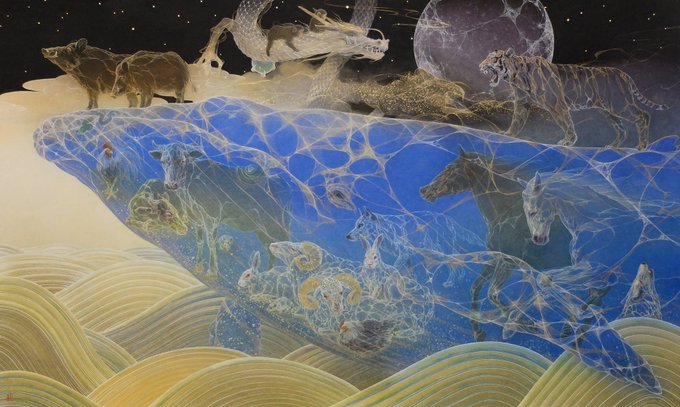 この絵はどこの会場に出せるか未定なので、SNSに載せようかと。 明るい気持ちになれる絵を描きたくて、十二支をモチーフに選びました。 いつか展示会場で直接見てもらいたいと思います。 M100号 「舟旅」 雲肌麻紙、典具帖紙、岩絵具、金泥、顔料 2020年