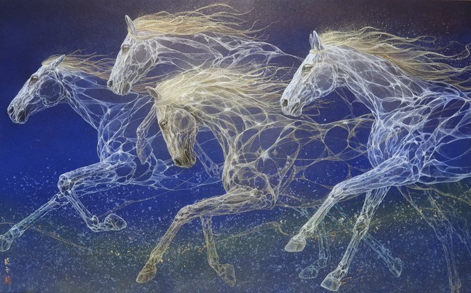 引き篭もりの自分の代わりに、気持ち良く風になる馬を描いた。 P50 天つ風 2022 雲肌麻紙、典具帖紙に岩絵具、金泥、銀泥、箔、顔料