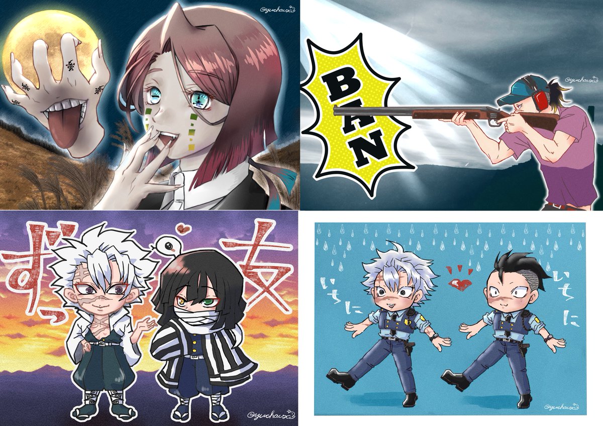 #今月描いた絵を晒そう #今月描いた絵を晒す ①枚目はアコちゃんが描いてくれた🕷君とコラボした模造ダ🌟カ🌟ラ ②枚目はkm学のワンシーン模写✨ ③枚目は🎴誕絵。 ④枚目の🐰はももちゃんの絵をリメイクさせて頂いた時の絵。 (ツリーにrkgkやchi-かわ風味kmt、ぽて🧹等)