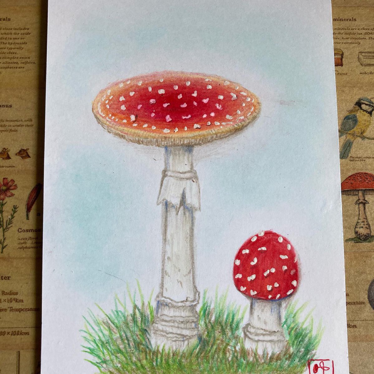 #絵が上手くなりたい #色鉛筆画 #ベニテングタケ おはようございます。今朝はからっとして爽やかな朝。大学生の息子が珍しく朝から出かけているので、寝具周りの洗濯します。またまたベニテングタケ🍄。きのこは可愛いです。