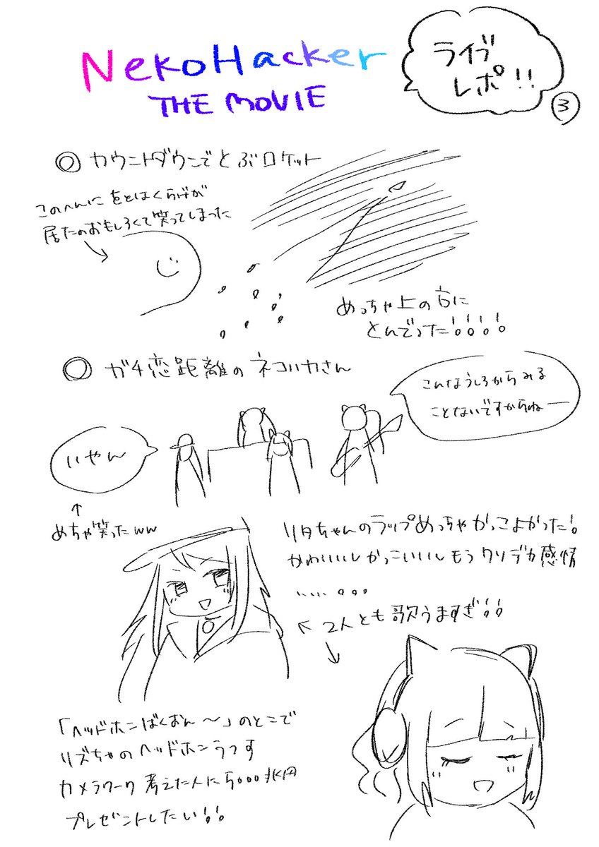 #ネコハッカーザムービー ライブレポです!!!!!勢いで描きました!!!!間違ってるとこもあるかもですがもうとにかく全て良かったです最高!!!!またライブしてください〜〜〜〜〜〜〜〜〜〜😭😭😭😭😭