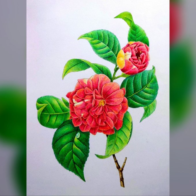 10 99 #大人の塗り絵 #美しい花編 より椿完成🍀 最初はお手本見ながら塗ってたけど途中からは好きに塗った✨ 楽しければ良し! 23/01/22 18:36