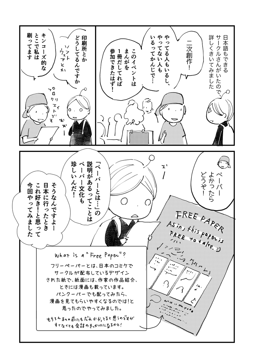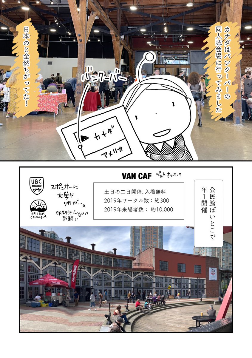 2022年5月にバンクーバー同人誌会場に行った話。驚いたのは、開催目的が漫画の売買というより、「漫画を通して会話すること」だったことです。英会話必須…! 続きはtakada.fanbox.cc/posts/5205645? Pixiv Fanbox(月額100円。漫画を150枚以上、放置中です)で、どうぞ〜。全5枚です。