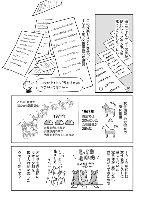 「日本の政界は見渡す限り男性なのに、どうして北欧は女性議員が多いんですか?」ときいたら、本「男を消せ」by 三井マリ子 amzn.asia/d/1a6doCU を教えてもらいました。その選挙方法が、さすが元ヴァイキング!でおもしろかった。漫画4枚。