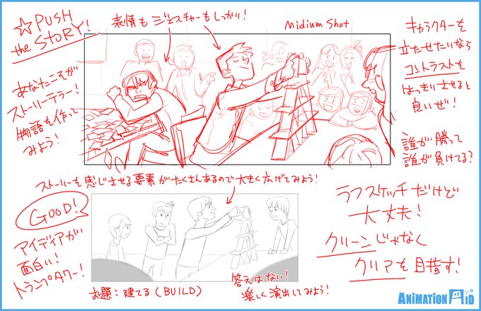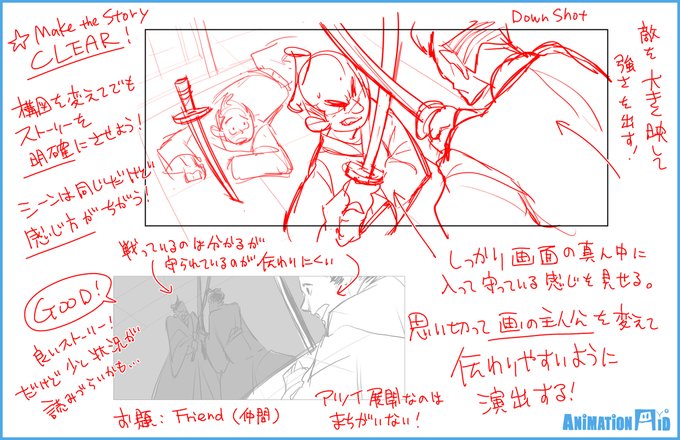 さくさく添削。ストーリーボードクラスの課題の一つで「ワンワードアサインメント」といったものがありまして。一言お題をもらって絵作りGOGO!カジュアルに挑戦できて構図や演出など色々学べます。やっぴー!(続く) #アニメーションエイド #唯さんクラス