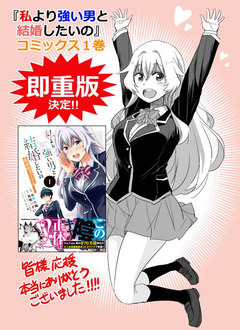お知らせです 『私より強い男と結婚したいの』1巻の即重版が決定です! 初動重版は初めてなので嬉しいです! 応援していただいた読者の皆様、原作の高橋びすい先生、キャラデザインのNagu先生、キャラ原案の水平線先生に厚く御礼申し上げます! こちらで1巻の続き読めます comic.webnewtype.com/contents/watat…