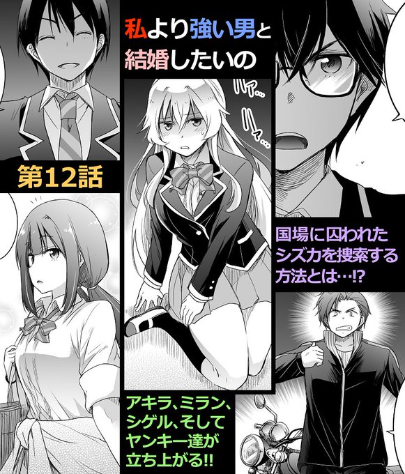 告知です! 物理最強×恋愛最弱ラブコメ『私より強い男と結婚したいの』コミック版12話が掲載されました comic.webnewtype.com/contents/watat… ついに裏の顔を見せた国場の罠にはまりさらわれたシズカを救うため、アキラやミラン、そしてシゲルをはじめとしたヤンキー達が動く!というお話です
