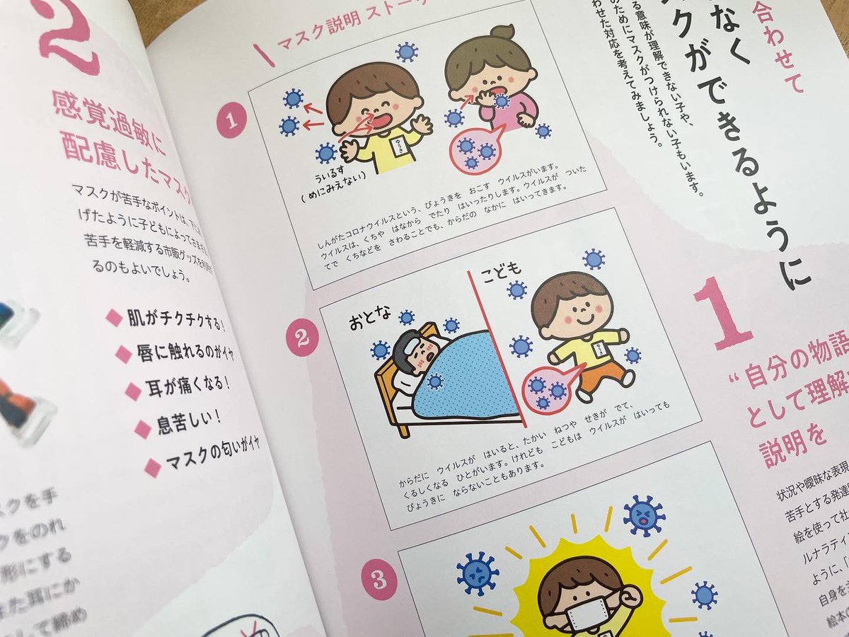 1 13 「発達支援 PriPriパレット」4・5月号(世界文化社) 新型コロナ対策とマスク保育特集「マスク説明ストーリー絵本」のイラストを描かせて頂きました✨ 巻末にはこちらのイラストをコピーして作る絵本の作り方も掲載されています✨ 22/03/10 18:42
