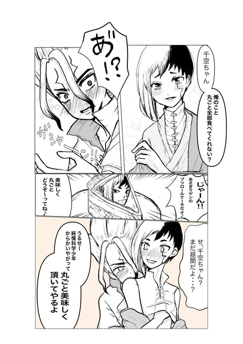 千ゲ/ホワイトデー漫画💚💜 ※バレンタイン漫画とは全く繋がってません ホワイトデープリケーキが可愛くて描きました! 石世界ではきっとフラが作ってくれるはず
