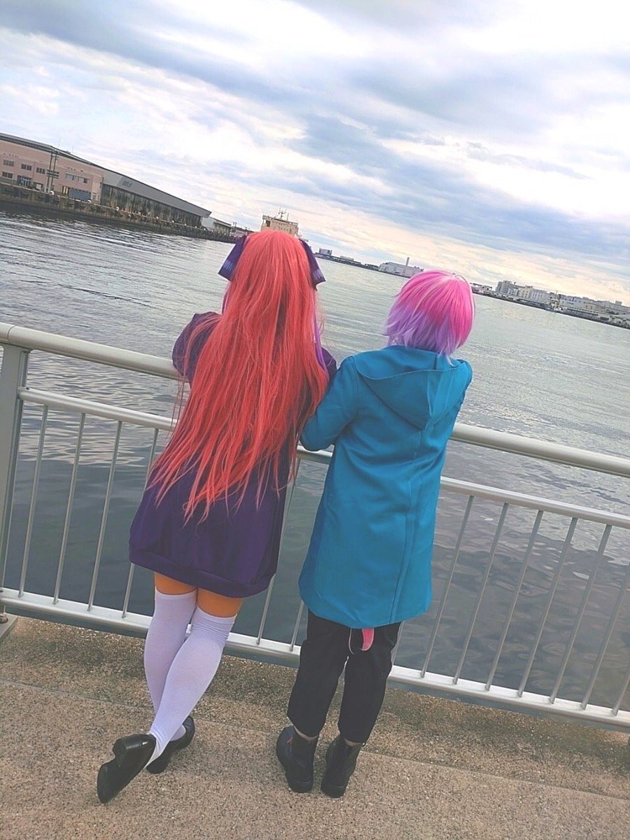 海と桜、校舎をバックに… ハンドサイン逆になったね!寝ぼけてたから仕方ないね!(言い訳)ダイスの顔隠してるのもウケる。 あまりにも緑緑でようやく見つけたピンクちゃんと一緒に撮ってもらった #コス博