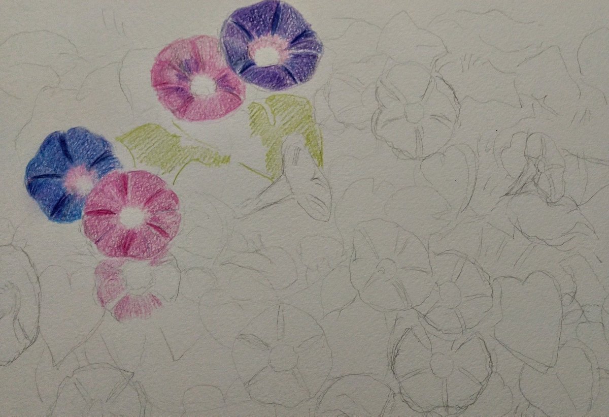 あとすこし・・✨やっぱり 着色苦手だから、余り上手く 描けなかったけど、ここまで 頑張りました💪これは 水彩画として、完成させようかと思ってます。 #朝顔 #水彩色鉛筆 #絵描きさんと繋がりたい #絵が上手くなりたい