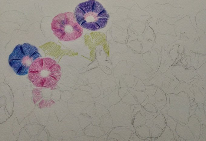 こんにちは。先程仕事を終えて 帰宅してから、再度 朝顔の色鉛筆画にチャレンジしていますが、着色苦手な僕にとっては、中々上手く進まず・・💧 この調子だと暫く掛かりそうですが、頑張ります✊‼️ #絵描きさんとつながりたい #色鉛筆画