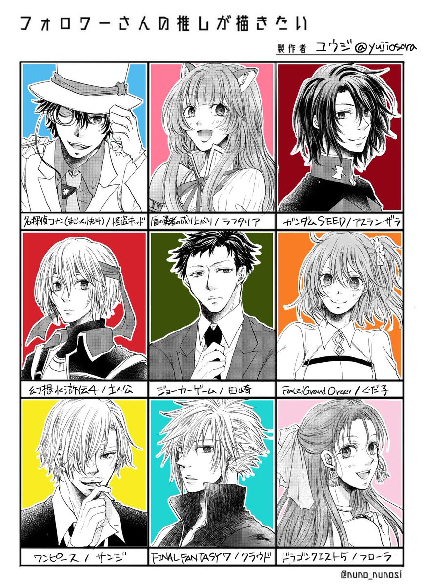 #フォロワーさんの推しが描きたい 怪盗キッド、ラフタリア、アスラン、幻水4主人公、田崎、ぐだ子、サンジ、クラウド、フローラと、追加でいただいたゼロスです!(個別に描いたので線の太さ合ってなくてすみません;)いろんな子描けて難しかったけど楽しかった!ありがとうございました~!✨