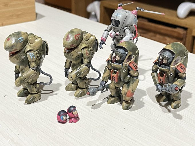 おはようございます(^^)マシーネンクリーガー1/35 グスタフ とガチャーネンの ラプター×2 と フリーゲ、完成致しました。個別に撮影して再度UPします♪ #マシーネンクリーガー #ガチャーネン #グスタフ #フリーゲ #ラプター #オッサンズモデラー #プラモデル製作 #ガシャポン
