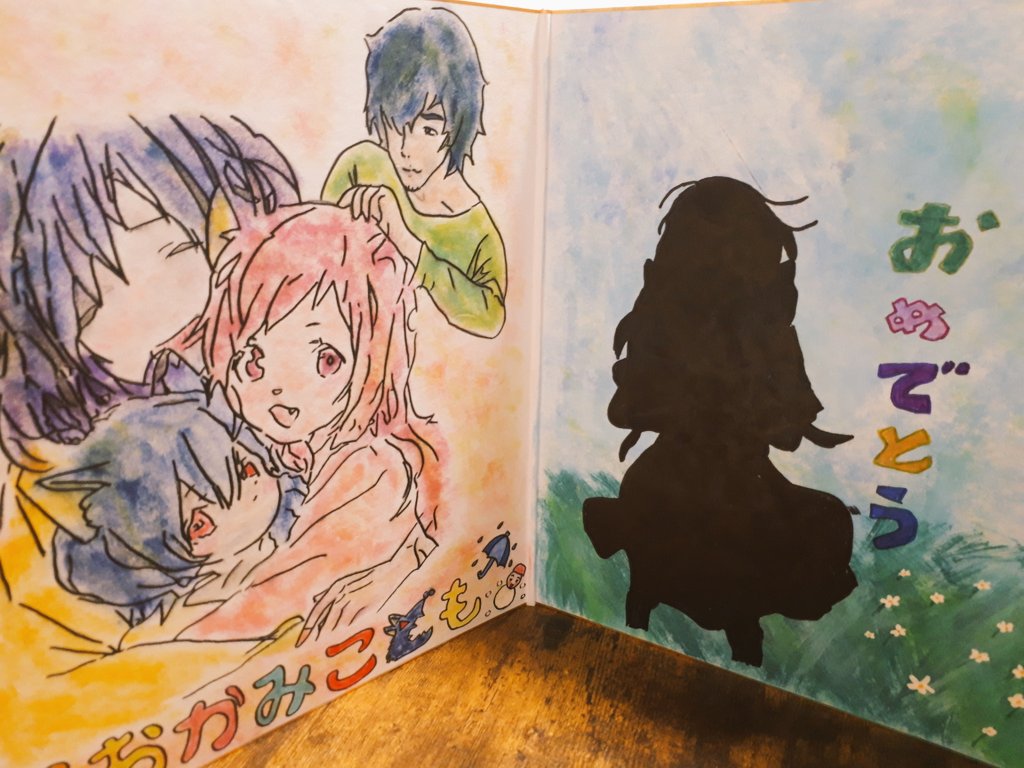 #イラスト #下書き #おおかみこどもの雨と雪 全体図です(2つ折りの色紙に描いてます)