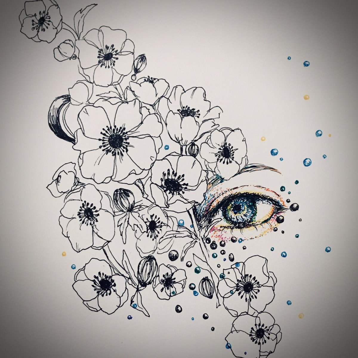 ちょっとずつ描き進んでる。 明日は早起きなのでこれくらいにしとこ。 #イラスト #ボールペン画 #ペン画 #絵描きさんと繋がりたい #アネモネ #瞳