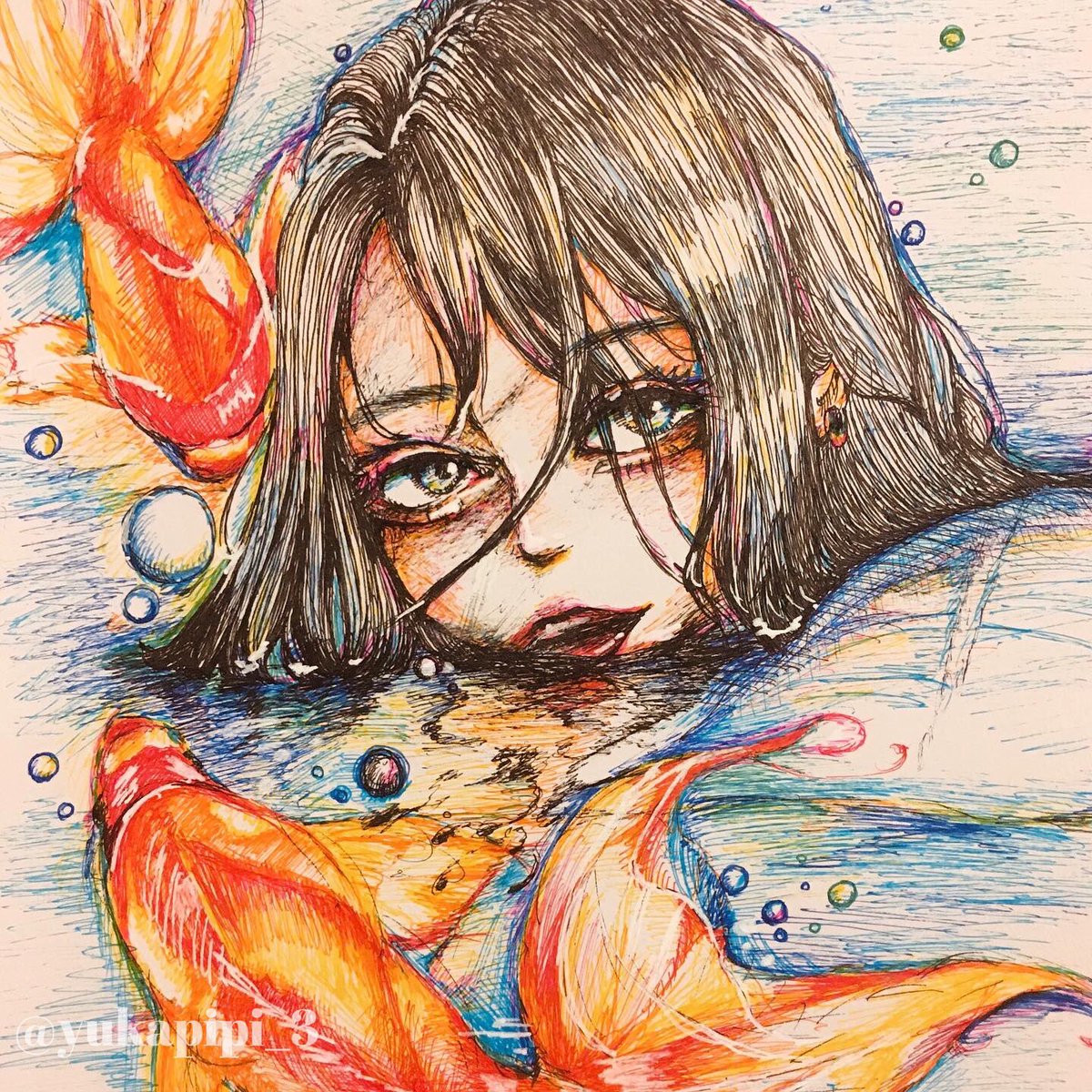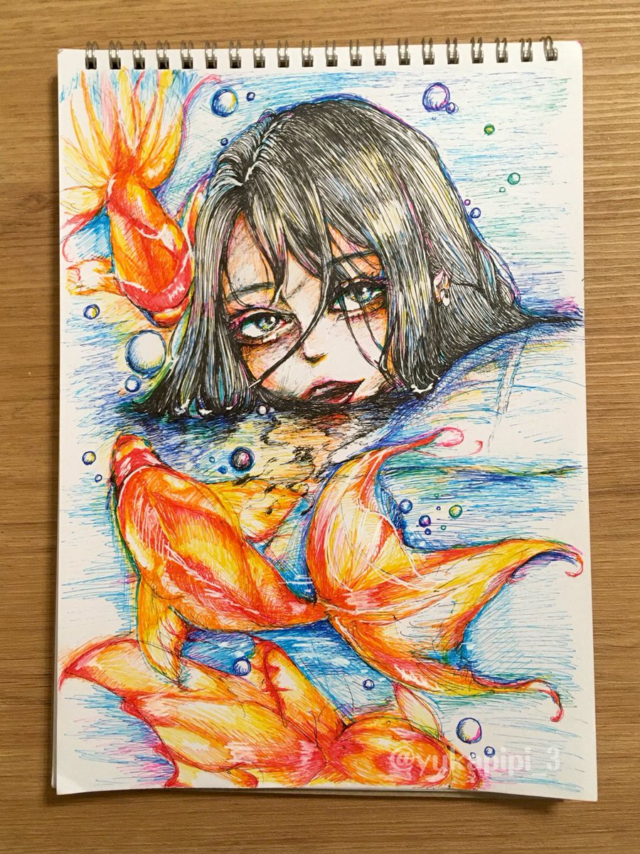 泡沫 カラーボールペンもすき。 #イラスト #お絵かき #ペン画 #金魚 #illustration #絵描きさんと繋がりたい