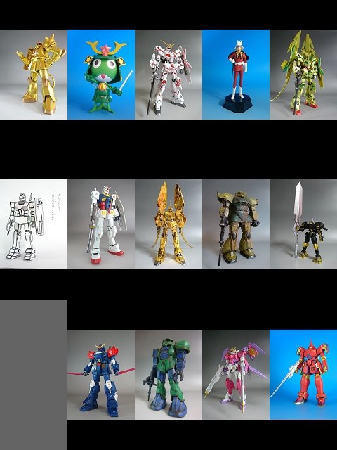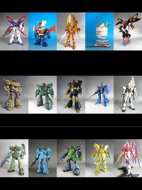 #今年作ったプラモ晒そうぜ その③。HGユーラヴェンガンダム、HGオリジンザク、アーティファクトV2アサルトバスター、ベアッガイⅢ(あっつうまんまさすんずご装備、割り箸下手くそ友の会所属機)。
