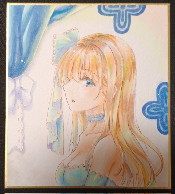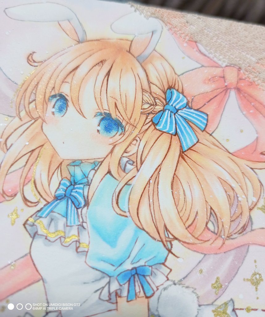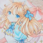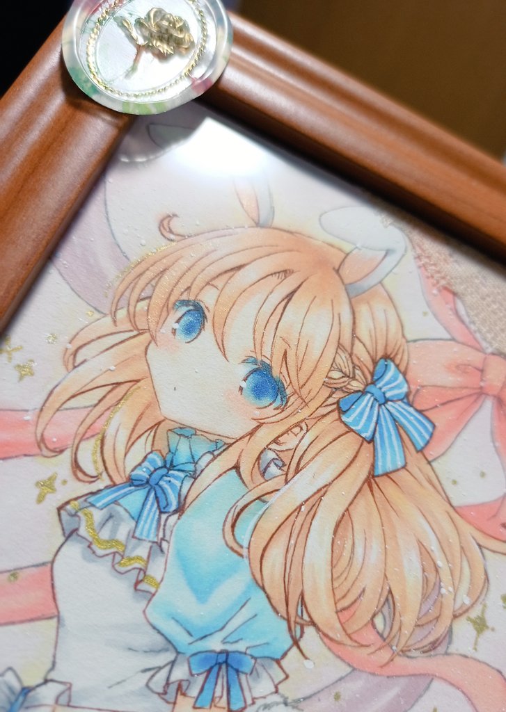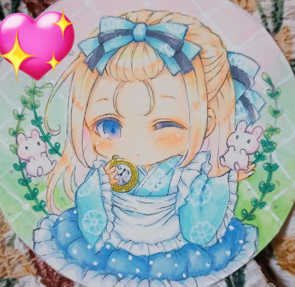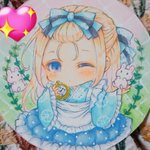 2/11~Gallery glad.様にて #ちいさなタカラモノ展2 に参加させていただきます🎁💎 リボンアリスちゃん🎀🐇 服や表情に金色をたくさん使いました✨ スカートに下げてる時計の文字盤が小さいのでとても慎重に描きました🕰 #ちいさなタカラモノ展2