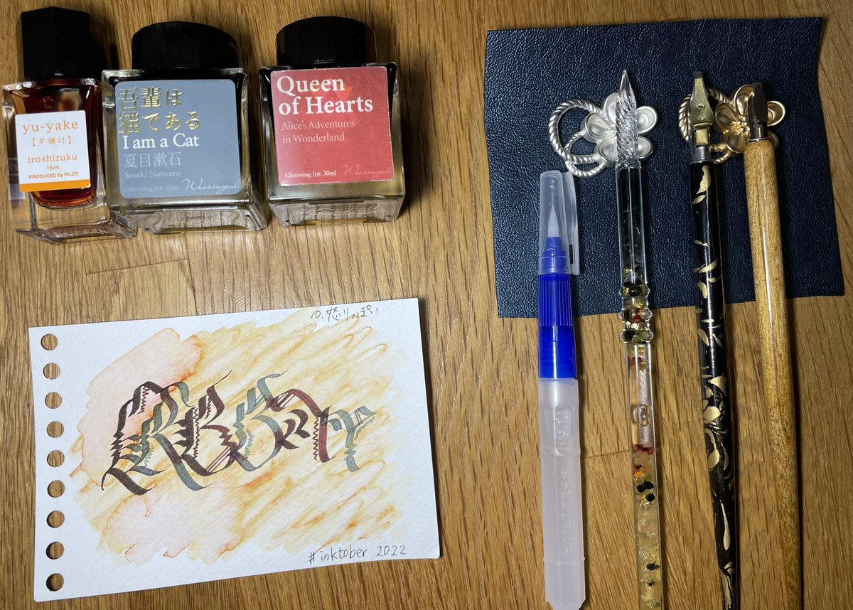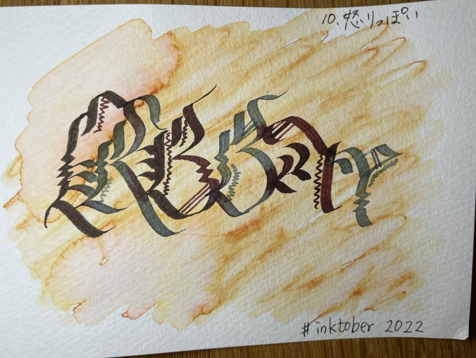 インクトーバー10日目 怒りっぽいって難しい💧トゲトゲしく神経質な感じ目指したけど…😓 #inktober2022 #calligraphy ・ルタンダ体 ・スピードボールc-2 ・ブラウゼ3.0 ・ガラスペン ・水筆 ・夕焼け ・Queen of Heart ・吾輩は猫である