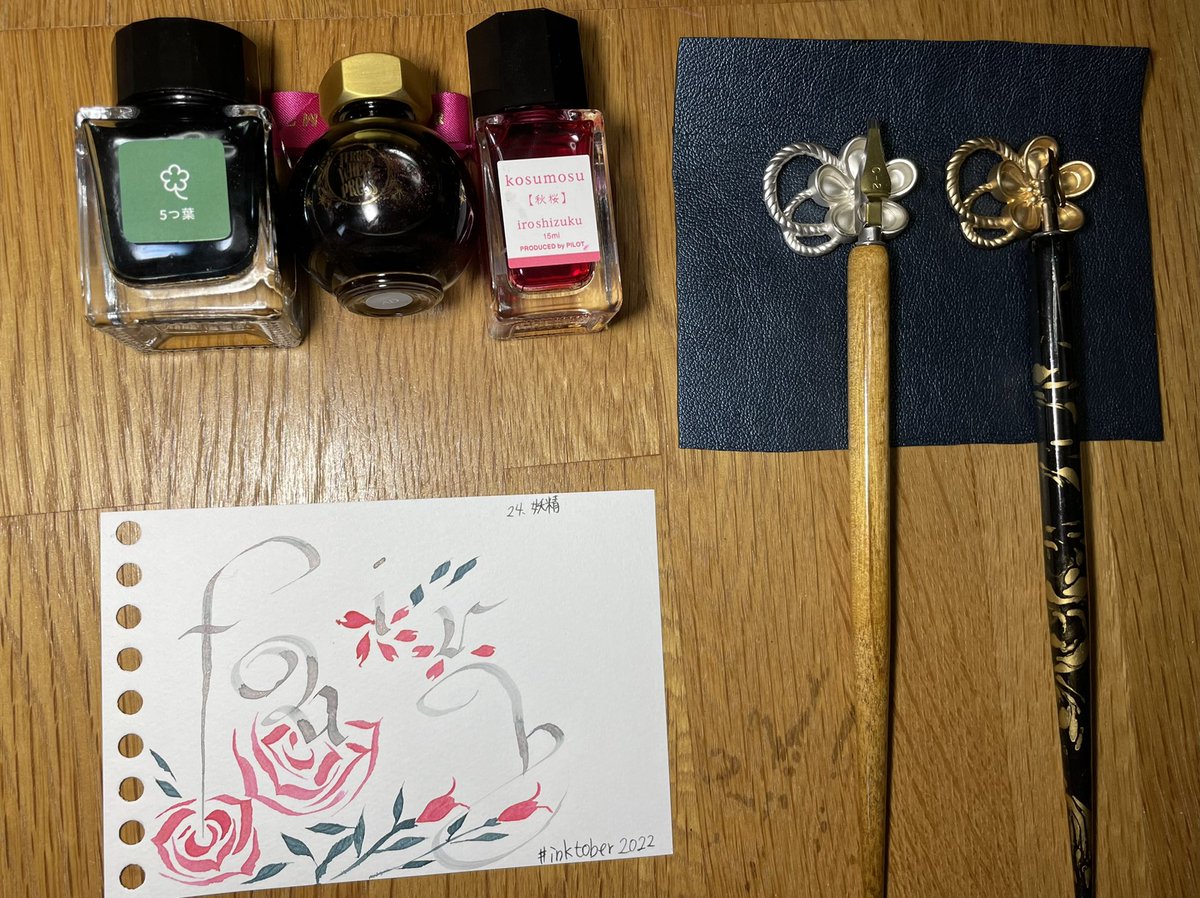 インクトーバー24日目 カリグラフィーのお花に挑戦!難しいんやけど、絵よりは描くメソッドが決まってるからチャレンジしやすい✨ #inktober2022 #calligraphy ・フレミッシュ体 ・スピードボールC-2 ・ブラウゼ2 ・アドベンチュリン ・秋桜 ・5つ葉