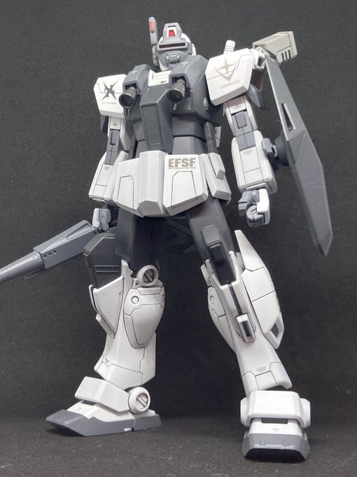 ナイトシーカーの本体にジムIIIの両腕と下半身を小改造で設置 ライフルはUCマラサイ シールドはハイザックから 右肩のマークはエナメルでそれらしく手書き 良い感じにマッシブになって満足な仕上がりになりました! #ジムナイトシーカーヴァースキ機 #ジョニーライデンの帰還 #ジムの日