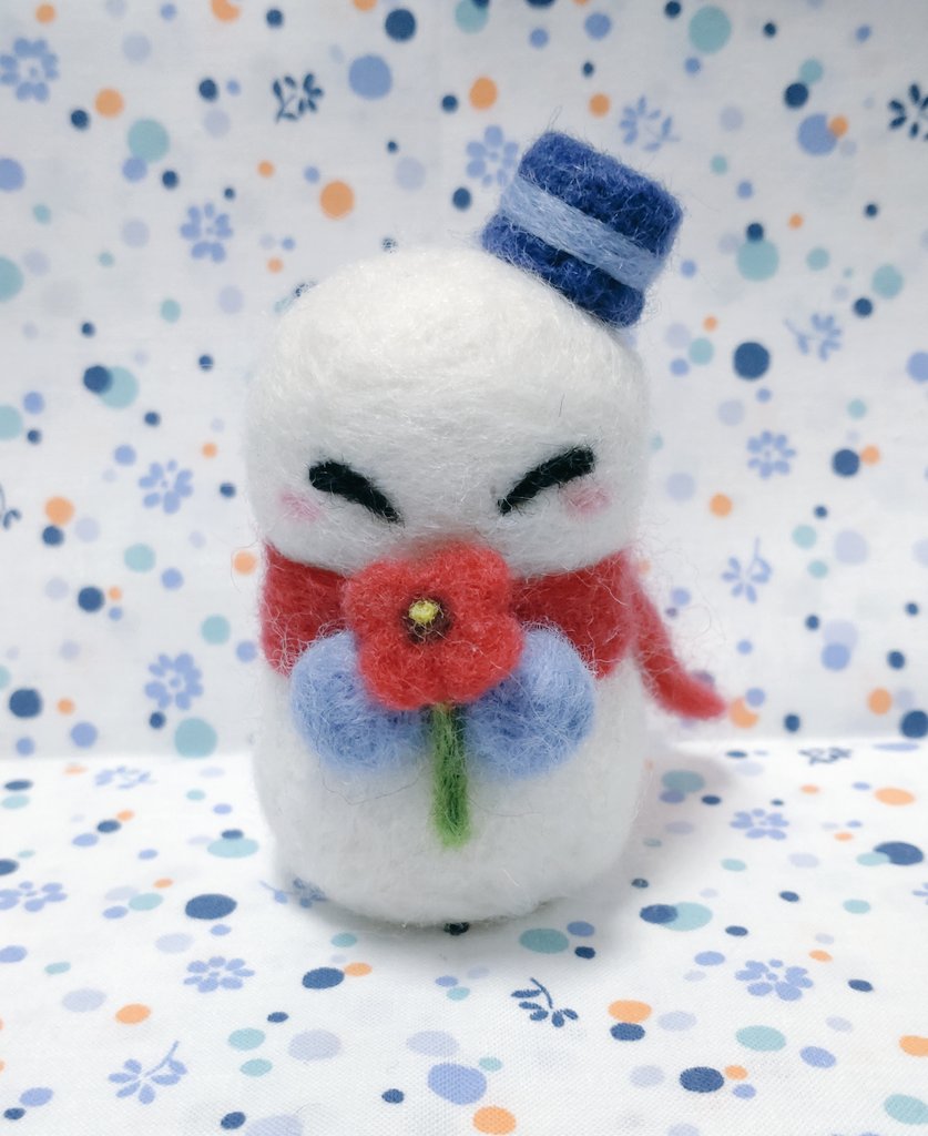 ポピーを貰って喜んでいる雪だるまくん 作りました( * ॑꒳ ॑*) #見るかもわからん #羊毛フェルト