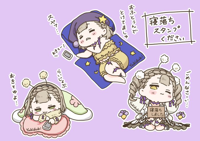 #シノアリス_ファンアート 当ギルドは寝落ちに寛容なんですけど、寝落ちしそうな時に予告用(?)にスタンプがあったら良いな~っていう妄想。 お分かりいただけたかと思いますがミツバチいばらちゃんとちょうちょいばらちゃん推しです! 左から だいぶ眠い→目が開かない→寝落ち後用