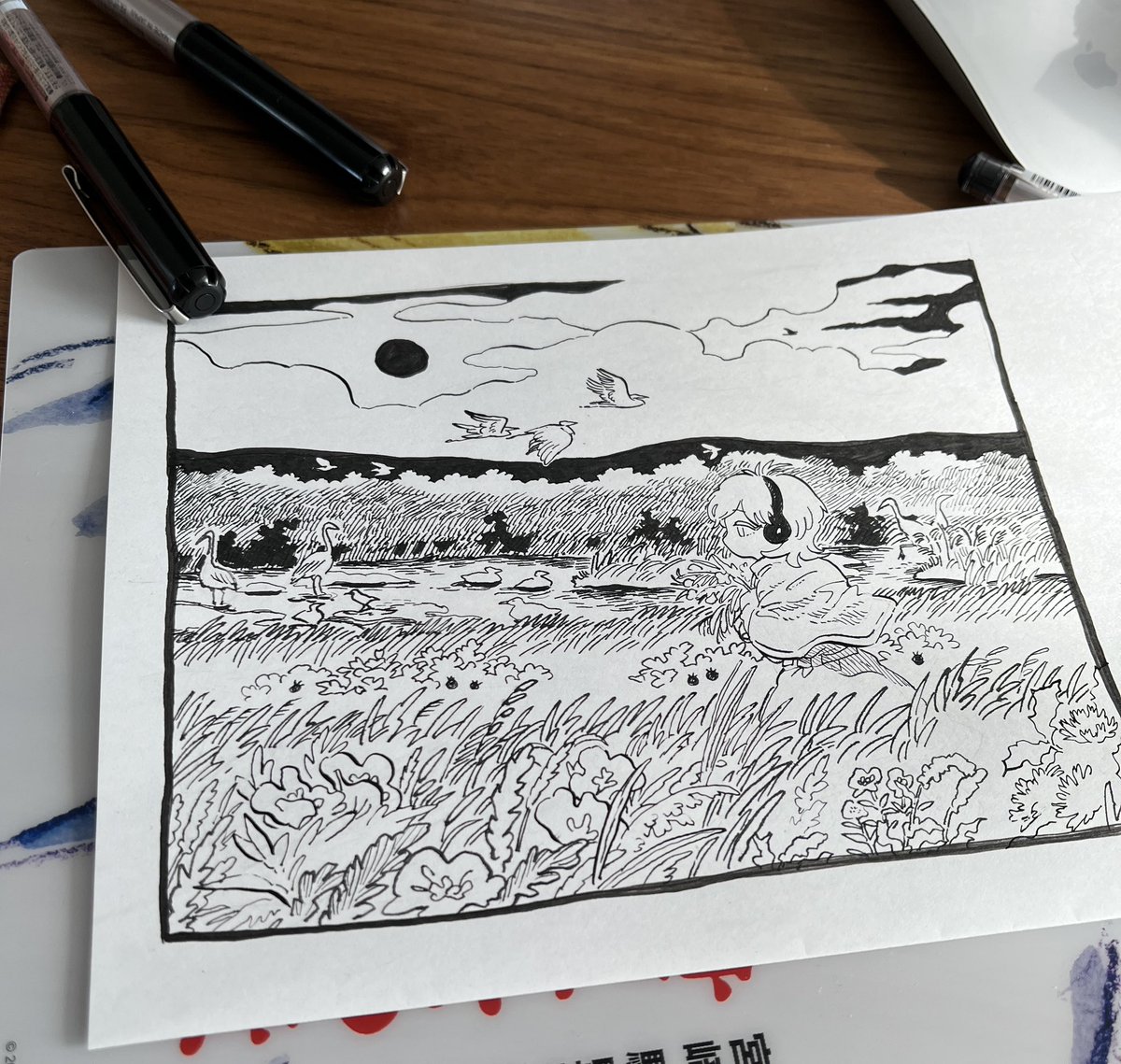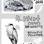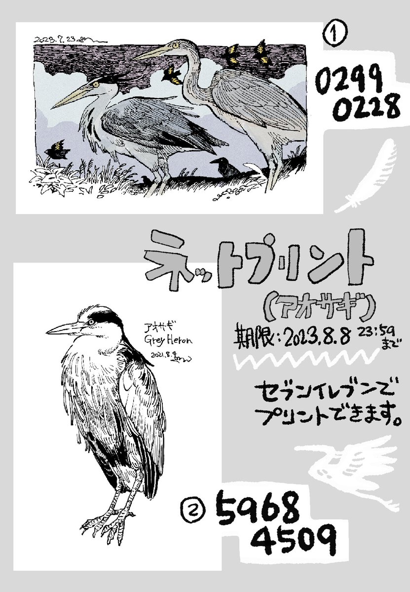 リクエストあったので、アオサギ(既存絵)とガ(描き下ろし)のネットプリント登録してます。期限はどちらも8月8日までです!セブンでプリントできますのでよければどうぞ〜