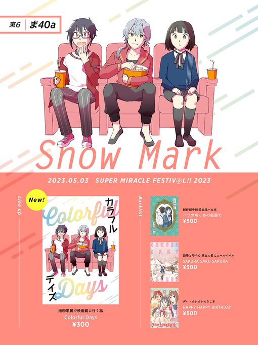 5/3ミラフェスお品書き 東6ホール ま40a/Snow Mark 新刊サンプル pixiv.net/artworks/10762… 漣四季麗で超常の映画を見に行く短いお話です。 既刊も少し持っていきます。当日はどうぞよろしくお願いします🙇♀️