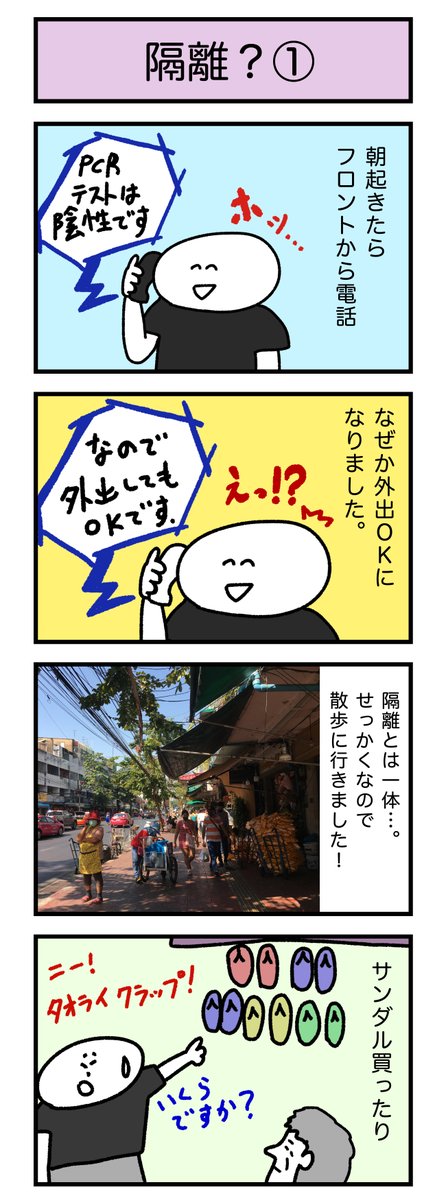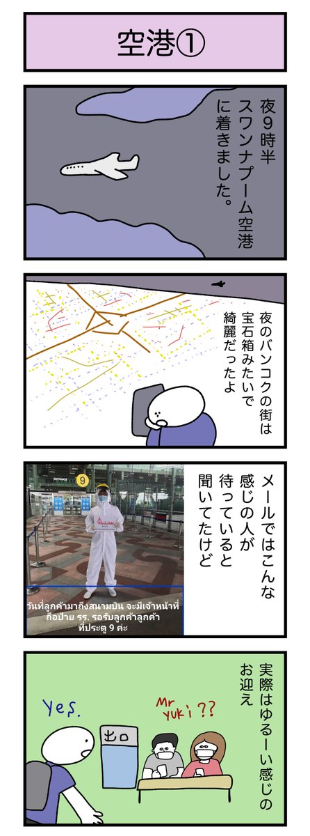 4 37 7日間隔離される予定だったんだけどなぁ〜😅 でも一足先にタイの空気を吸えてよし!ですね😆❗️ #タイ #タイ旅 #世界の子どもたちに絵本を届けに行く #バンコク #4コマ漫画 #コミックエッセイ #イラスト #海外 #旅 #旅行 22/01/10 15:58