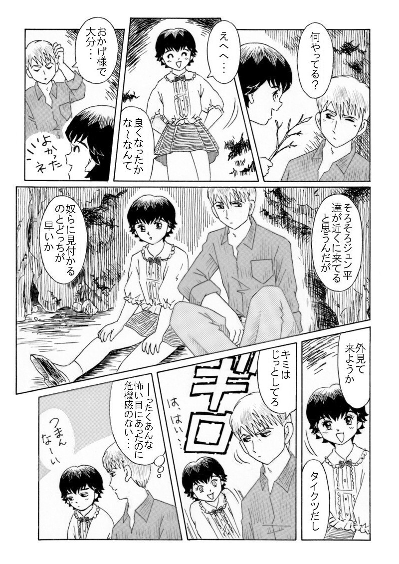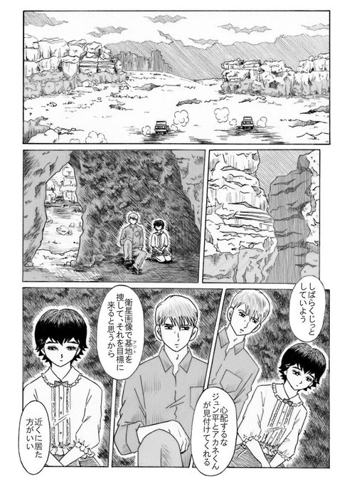 Twitter調子戻ったのかなぁ❓ こちらは本垢裏垢共に何も起きなかったけど様子見ながら予約投稿💦 解説(ΦωΦ)ジュン平👦アカネ👱♀️やっと到着🛻早く2人を見付けて👨👧 第8話後半p05 #芸術同盟 #漫画が読めるハッシュタグ