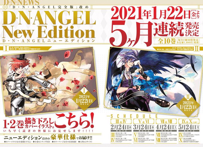 349 1238 豪華仕様の新単行本「D・N・ANGEL NewEdition」5ヶ月連続発売中! こちらは5、6巻のカバーです。華やかな感じにデザインしていただきました。 よろしくお願いします! 21/02/21 14:06