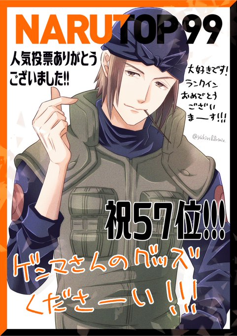 不知火ゲンマ57位…!!今日という日を一生忘れません(´;ω;)ありがとうございます。大好きです!! ランクイン記念にグッズを下さい!!!! #NARUTOP_ART #NARUTOP99