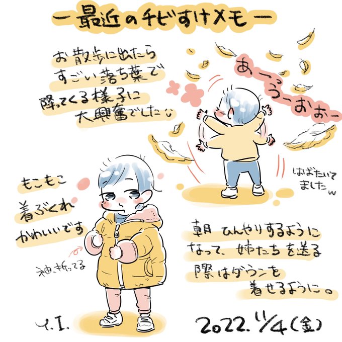 1 22 最近お散歩に出ると落ち葉がすごくて、チビすけさくさく引きずるように埋もれて歩いてます🍂おチビもおんなじ様に歩いてたなぁ〜なんて、既におばあちゃんになって孫を見てるみたいな気持ちになる笑 #育児絵日記 #チビすけの事 #チビ達の日常 22/11/04 13:59
