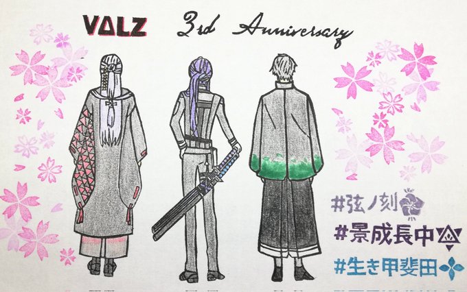 VΔLZ3周年おめでとう!!🎉🎉 沢山の楽しいをありがとう!!! #描いた晴 #長尾百景 #下弦画 #桜魔の土産 #VΔLZ3周年 ※御三方の後ろ姿の写真をお借りして、消しゴムはんこを彫りました。 問題があれば削除します。