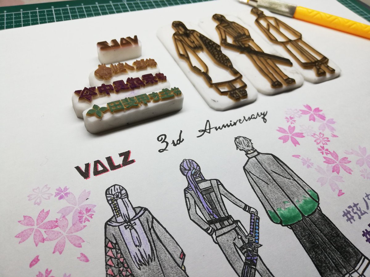 3 19 VΔLZ3周年おめでとう!!🎉🎉 沢山の楽しいをありがとう!!! #描いた晴 #長尾百景 #下弦画 #桜魔の土産 #VΔLZ3周年 ※御三方の後ろ姿の写真をお借りして、消しゴムはんこを彫りました。 問題があれば削除します。 23/04/02 10:54
