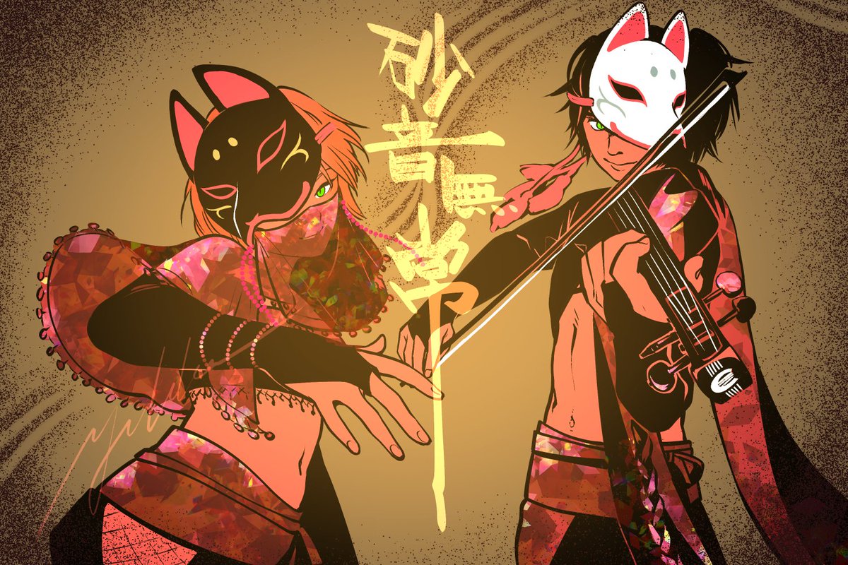再掲。 サンドアートxヴァイオリン一人多重奏ユニット、砂音無常(@saonmujou)のお二方を描かせていただきました。