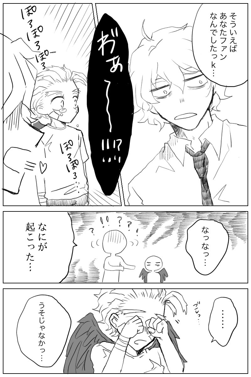 58 503 ちびホと若めらさんの話。全7枚 「嘘じゃない」 ⚠️ここどこ状態ですがこ〜あんのどこかです。なるべくトーンとか使わず描いてみたかったのですがその結果真っ白になってしまった。 若めらさんに夢を見ている。 21/08/21 11:05