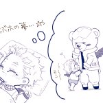 ばぶホのお昼寝中に急遽会議が入り、その場を離れた炎さん。 ばぶは起きた時炎がいなかったので珍しくギャン泣き。いつものSKもすぐ来れないので炎が迎えに行き、会議はばぶホ抱っこのまま続行。重要な話の中でばぶホの鼻が「ぴ」と鳴る落書き。(長い)