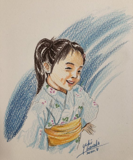 おはゆっこ😊 七夕だなぁ。こっちのほうは今は晴れてるけど、だんだん雨に向かうとか。 今年も天の川は渡れないのかな。 さて今日も頑張ろう。 子ども絵は3才の長女と中1の次女。 浴衣は良いねえ。 #似顔絵 #色鉛筆画 #家族アート