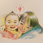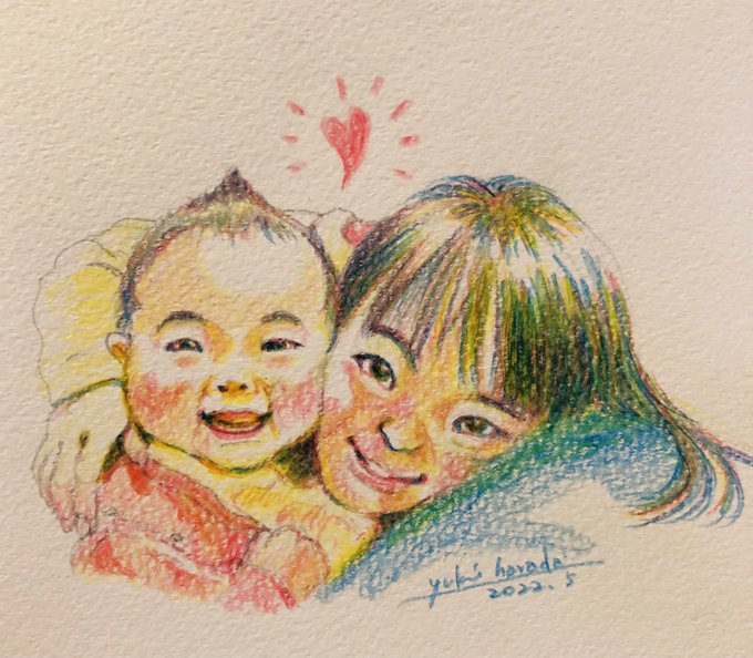 1 16 ゆっこんちは😊 今日はこどもの日🎏 社会人と高校生だけど、やっぱり大事なウチのこどもです。✨ 小1と生後半年の頃を3色描き✨ #似顔絵 #色鉛筆画 #家族アート 23/05/05 12:41