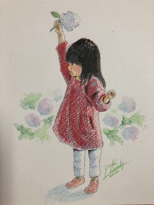 もうひとつ乗っかってみました🎵 紫陽花と幼い頃の娘です。 #雨音を聴きながらTLに紫陽花を咲かせましょう #色鉛筆画 #似顔絵