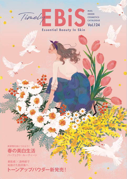 \お仕事/ レギュラーで担当しているエビス化粧品さん会報誌『TimelyEBiS』の表紙を描きました。光栄な事に好評頂いているようで今号から3年目になります..!今年度もよろしくお願いします。 ebis-cosme.co.jp